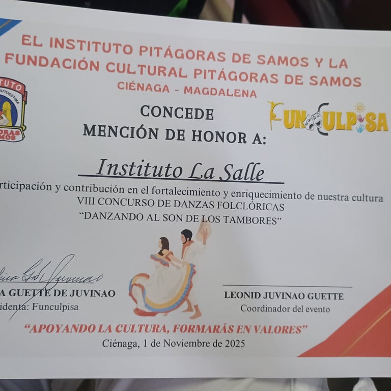 Nuestros talentosos estudiantes del grupo de danzas representaron con orgullo al Instituto La Salle en el VIII Festival Intercolegial de Danzas Folclóricas Colombianas – “Danzando al son de los tambores”, evento liderado por la Institución Educativa Pitágoras de Samos.