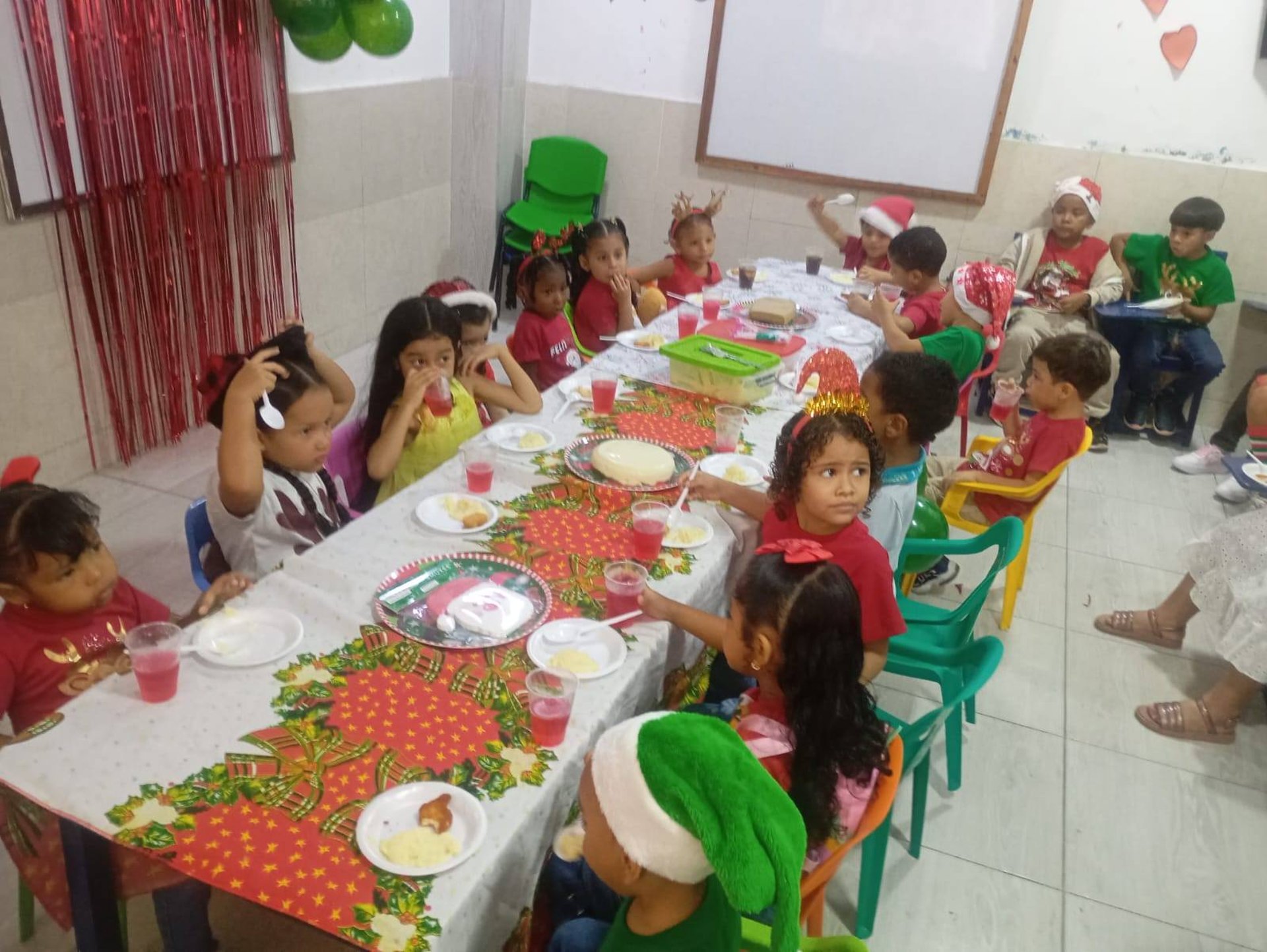 Mesas decoradas con motivos navideños, caritas sonrientes, niños disfrutando sus alimentos, profesoras animando el ambiente y un escenario preparado con amor para despedir un año escolar lleno de aprendizajes.