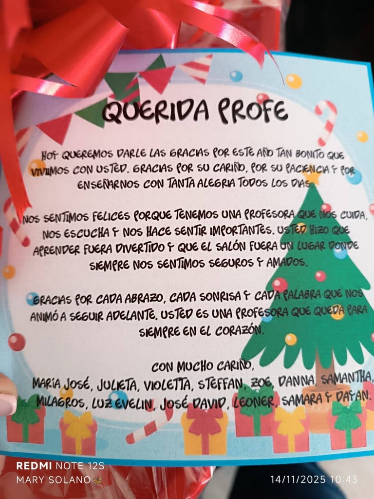 El mensaje de agradecimiento entregado por los niños a su profe, lleno de ternura y palabras sinceras, refleja la hermosa conexión lograda a lo largo del año: